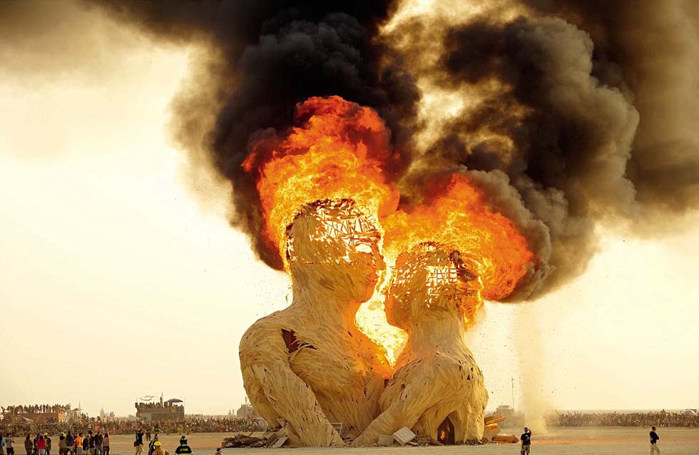 “火人节”一共为期8天,每年8月底至9月初在美国内华达州黑石沙漠举行。每年这个时间,来自世界各地的人涌入这里,所有的参与者被称作Burner。在沙漠中唯一售卖的是冰和咖啡,除此之外没有任何商业行为,所有生活用品必须自带。“Burner”们在节日中会穿着奇装异服,大家会围着观看一个10几米高的木制男雕像燃烧,以此庆祝节日。