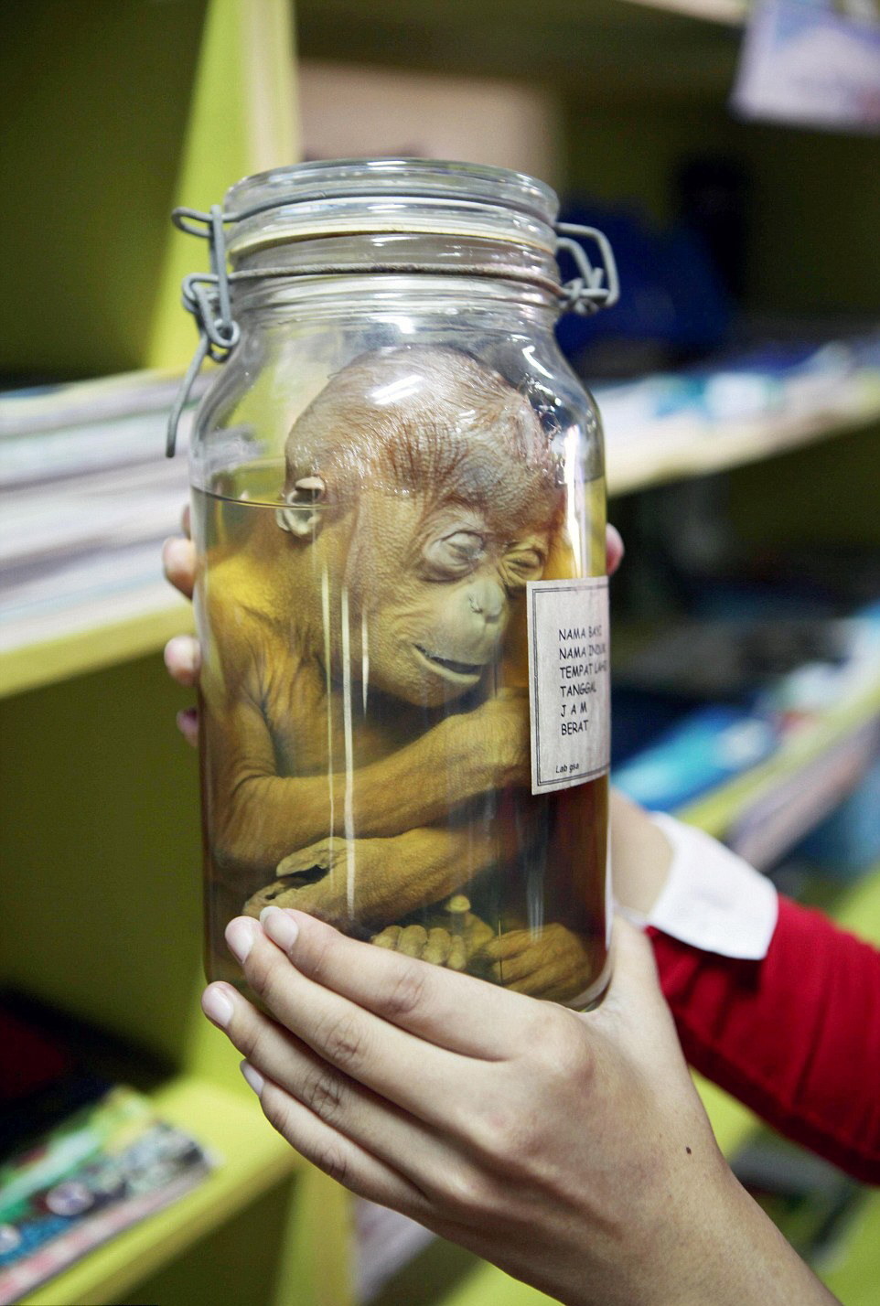 在这些罐装标本有一只红毛小猩猩。它像泡菜一样被保存在装有黄色液体的玻璃罐中,皮肤苍白,双眼紧闭,嘴唇略微卷曲似微笑。双手双脚蜷缩,像是在睡梦中拥抱自己。和参观者的手比起来,它看起来非常娇小。