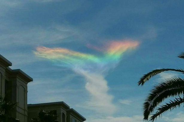 据英国《镜报》8月20日报道,上周日在美国南卡罗来纳州的棕榈岛,一个凤凰展翅高飞样子的彩虹出现在天空,持续了近一个小时之久,引得人们拍照留念。
