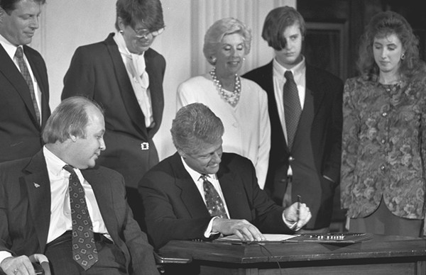 1993年11月30日,克林顿总统在白宫签署“布雷迪法案”。坐在克林顿旁为前白宫新闻秘书布雷迪,1981年他在里根遇刺案中遭枪击受伤,此后一直靠轮椅行动。