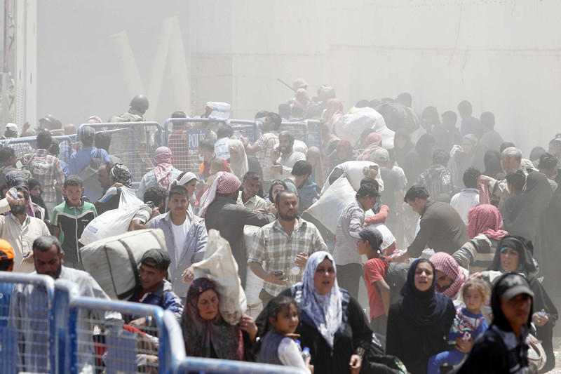 图为6月14日,在与叙利亚接壤的土耳其桑利乌尔法省的阿克恰卡莱,叙利亚难民等待进入土耳其。