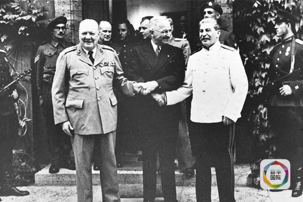 这是1945年7月,在德国柏林附近的波茨坦,英、美、苏三国首脑丘吉尔(左)、杜鲁门(中)、斯大林(右)在波茨坦会议中握手。
