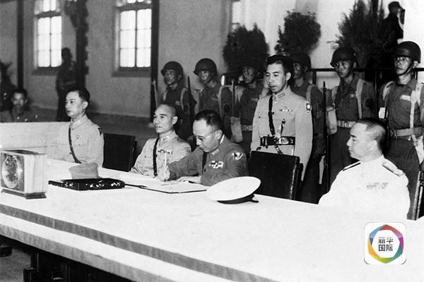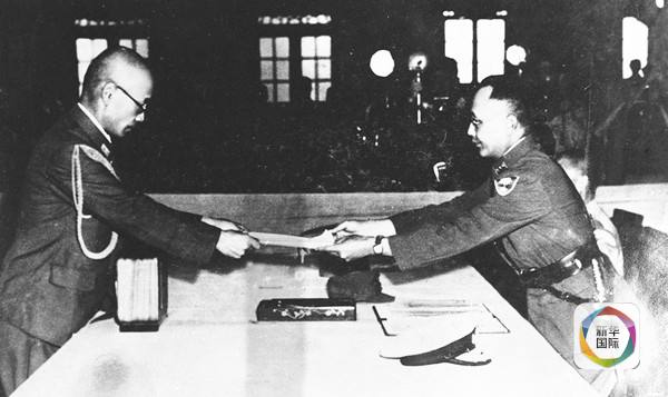 这是签字仪式上,何应钦(右)代表中国政府接受侵华日军总参谋长小林浅三郎递交的侵华日军总司令冈村宁次签署的投降书。