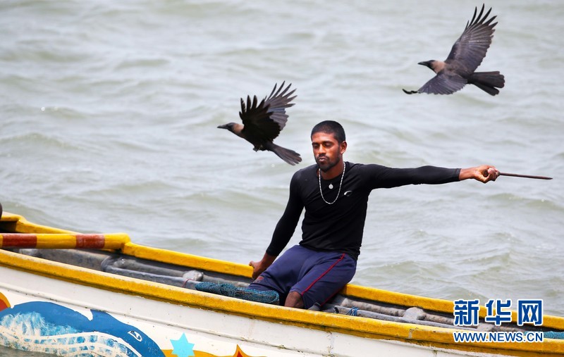 A32公路旁的马纳尔半岛渔港一名渔民正在驱赶争食的乌鸦。新华社记者 黄海敏摄