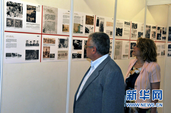 前来参加中国大使馆抗战胜利70周年座谈会的罗马尼亚朋友参观揭露日本侵略军在亚洲地区暴行的图片展《血写的历史》。新华社记者陈进摄