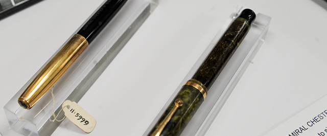 (图右这支深绿色笔上刻着一串英文:"victory pen admiral Chester· W·Nimitz",意为”胜利之笔,海军上将切斯特·W·尼米兹“)