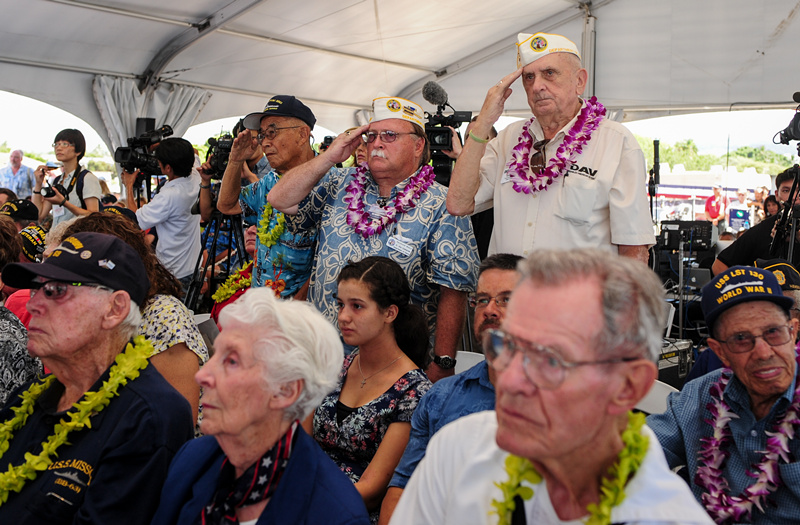 11位亲历日本投降签字仪式的“密苏里号”战舰老兵和12位参加过二战的美国老兵出席纪念活动。这些当年二十岁上下的年轻人,如今绝大多数已经年近九旬。