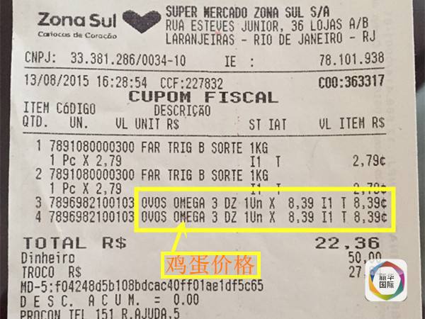 图为巴西超市里的购物小票,上面标注部分为鸡蛋价格。(记者陈威华摄)