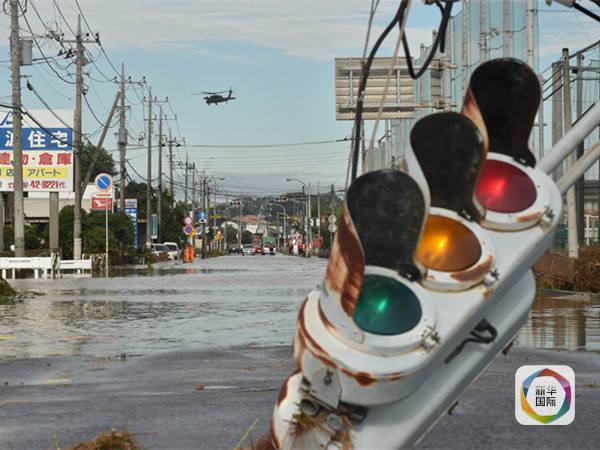 图为日本自卫队一架直升机飞过茨城县常总市被洪水淹没的街道。(图片来源:新华/法新)