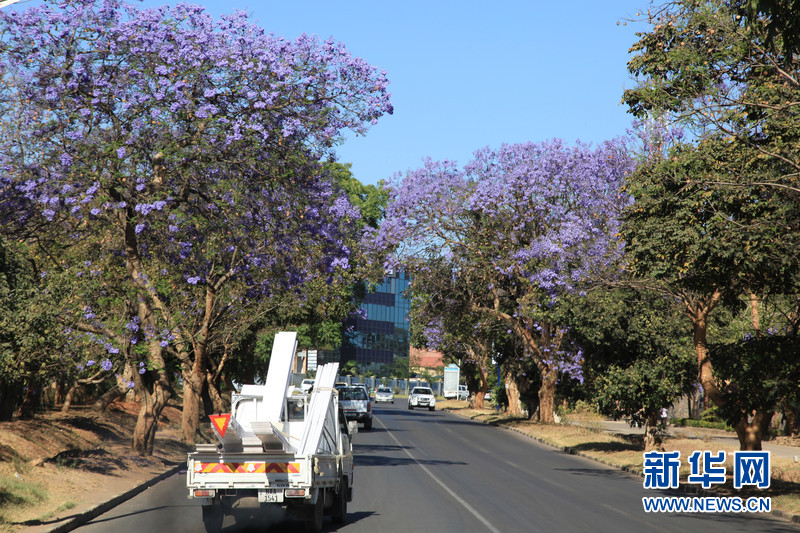 9月15日,在赞比亚首都卢萨卡,汽车在两旁种有蓝花楹的马路上行驶。新华社记者彭立军 摄