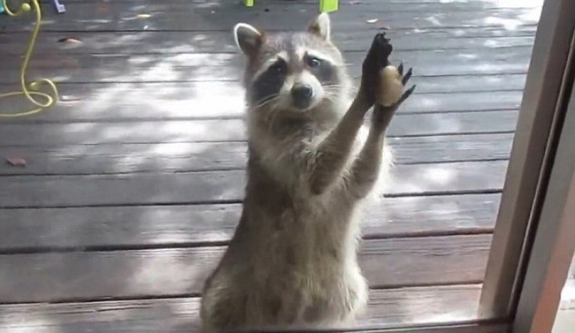 国际在线专稿:据英国《每日邮报》9月15日报道,近日,美国网友拍到一只贪心的小浣熊在偷完猫粮后,仍觉得不满足,于是拿着一块石头,后腿直立起来,在玻璃门前“咚咚咚”的敲门要吃的,这段不寻常的视频吸引了大量网友观看。