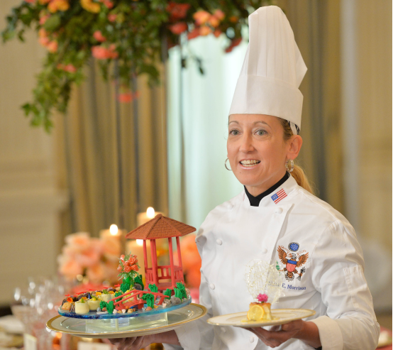 据莫里森介绍,“花园漫步”拼盘中有用巧克力制作的中式六角亭和小桥,还有白莲花形状的小甜点,这充分展现了国宴中的中国元素。