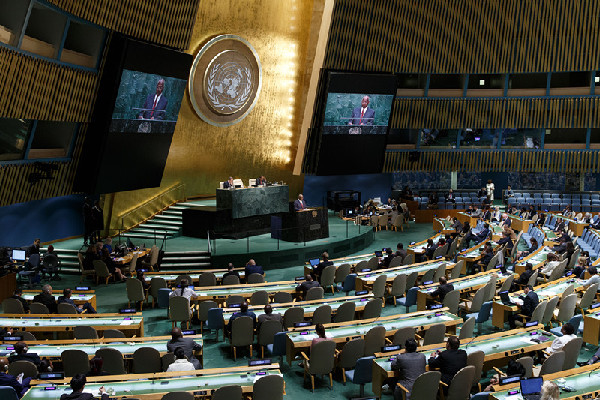 9月10日,在美国纽约联合国总部,大屏幕显示投票结果。(新华社记者李木子摄)