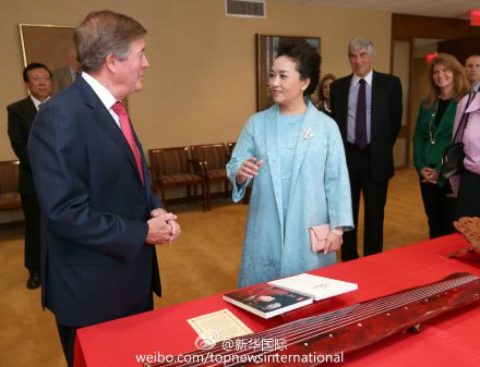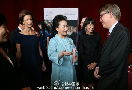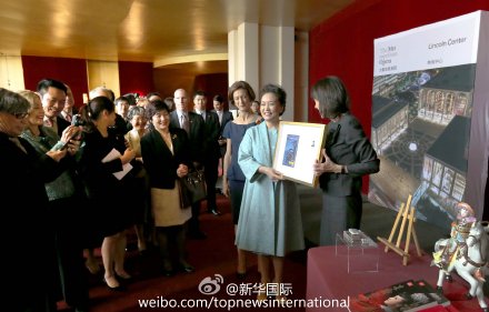 28日上午,彭丽媛参观纽约林肯艺术中心,与新老朋友共话中美文化交流成果。2005年,彭丽媛偕中国歌剧《木兰诗篇》在此成功上演。十年后,老朋友重逢,彭丽媛说,这么多年过去了,你们依然年轻,正是对艺术的奉献使你们青春永驻。