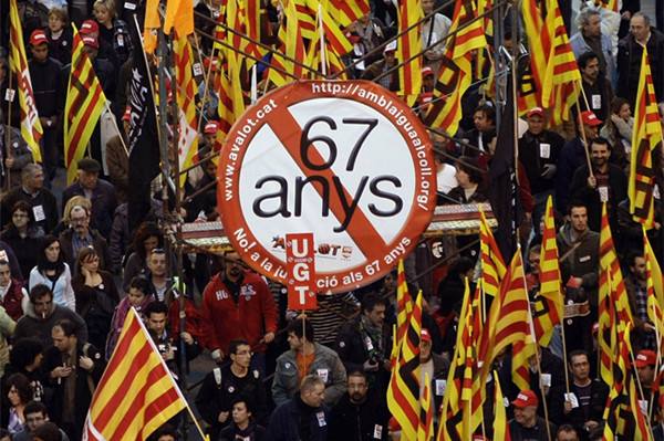 ↑在西班牙马德里,大批抗议者参加反对延长法定退休年龄的示威活动。