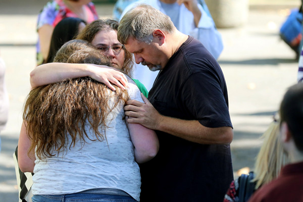 2015年10月1日,在美国西北部俄勒冈州罗斯堡,人们在出事后相互安慰。(图片来源:美联社)