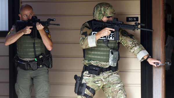2015年10月1日,在美国西北部俄勒冈州安普夸社区学院,警方在出事的校园内搜查。(图片来源:法新社)
