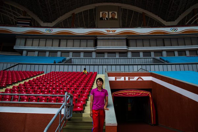 身穿运动服的朝鲜女性站在平壤绫罗岛5月1日竞技场里。