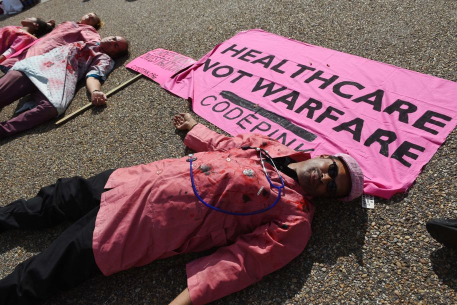10月7日,在美国首都华盛顿白宫前,人们举行示威活动,抗议美军日前轰炸阿富汗的一所医院。美国总统奥巴马当日致电国际医疗救援组织“无国界医生”,为美军日前轰炸该组织在阿富汗的一所医院表示道歉。“无国界医生”位于阿富汗北部城市昆都士的一所创伤中心10月3日遭到轰炸,共有12名员工和包括3名儿童在内的10名病人死亡。“无国界医生”发表声明说,轰炸是“战争罪行”。新华社/法新