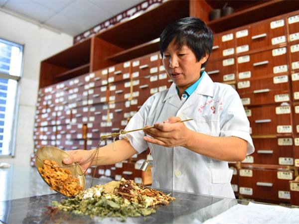 图为8月27日,在湖北省秭归县沙镇溪镇中心卫生院“国医堂”,中药师为患者抓取中药。