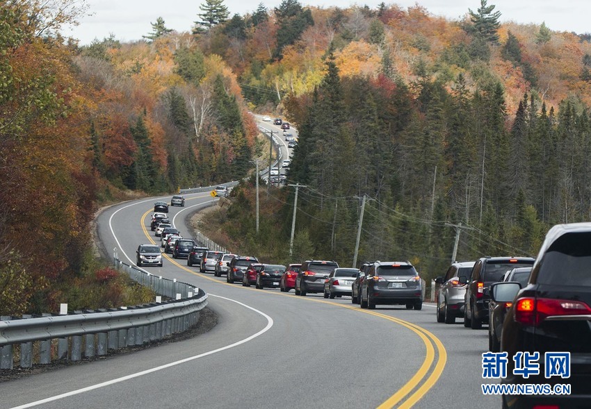 安大略省阿岗昆公园西大门前蜿蜒的山路上,排满了等待进入公园的车辆