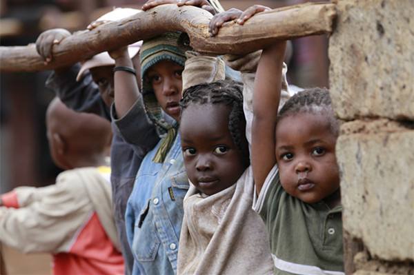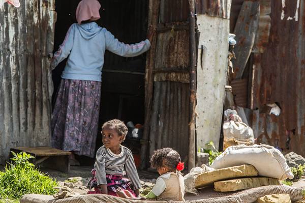 2013年10月13日,在埃塞俄比亚首都亚的斯亚贝巴一处贫民窟内,两名儿童在家门口晒太阳。