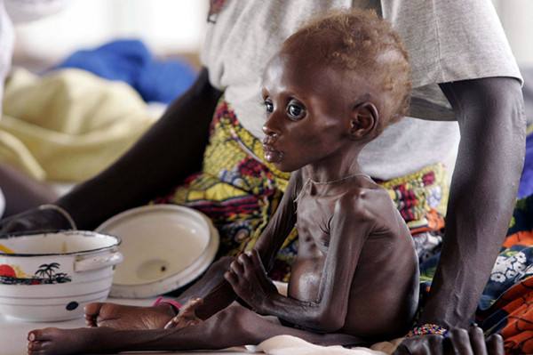 2005年7月7日,在尼日尔南部城市马腊迪的无国界医生组织的救助中心,一名患有严重营养不良的儿童在等待救助。