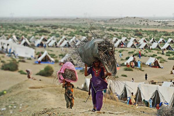2010年9月15日,在巴基斯坦信德省赛赫万的一处洪灾灾民安置点,两名女子扛着柴火。
