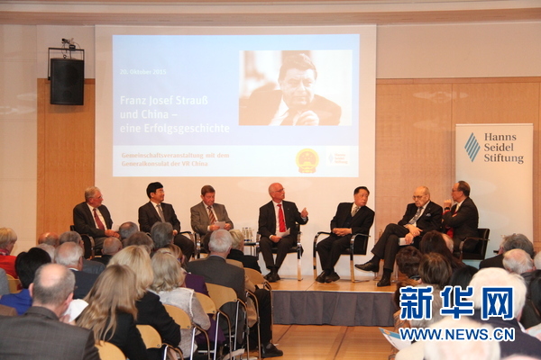 中国前驻德大使梅兆荣(台上右三)、曾在施特劳斯身边工作多年的基社盟政治家维尔弗里德·沙尔纳格(台上右二)等在报告会上回顾了施特劳斯访华的珍贵瞬间。施特劳斯是德国最具影响力的政治家之一,曾任基社盟主席20年,任巴伐利亚州州长10年。新华社记者宋国城摄