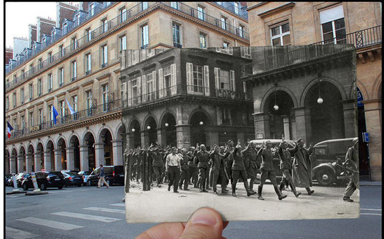 1940年,德国军队占领巴黎,军队从埃菲尔铁塔下面经过。现在,埃菲尔铁塔吸引了无数游客,几乎已经成为巴黎的代名词。巴黎最具标志性的地标建筑看上去与二战时几乎没有太大变化,唯一的区别就是今天来这些地方的是成千上万的游客,而二战期间则是士兵。法国艺术家朱利安·卡内兹(Julien Knez)将20世纪40年代的巴黎老照片与今天的照片融合,对比巴黎70多年来发生的变化。