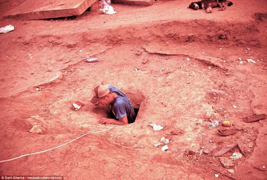 地下城的入口位于火车站前交通岛人行道上的一个洞中。每到太阳即将落下时,地下城的居民开始苏醒,就像活死人那样爬上地面。图为一名男子通过一个很小的洞口钻进下水道,当年的很多孤儿就生活在这些下水道里。