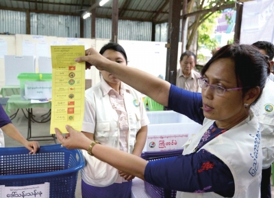 昨日,在缅甸仰光,一名工作人员在投票站展示一张选票。新华社发