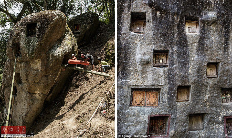 在仪式结束前,尸体会被放置在崖顶顶部一块大石头上。(左图)然后开启“灵魂之地”的旅程。(右图)