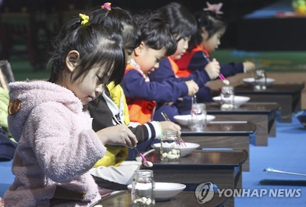 “筷子国际学术研讨会”前,韩国儿童在表演筷子夹豆(网页截图)