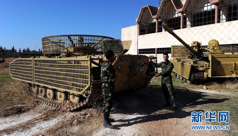 2015年11月13日,在叙利亚阿勒颇克韦里斯空军基地,两名政府军士兵站在缴获极端组织“伊斯兰国”战车旁。叙利亚军方11月10日宣布,政府军在空中力量掩护下,经过3天与极端组织“伊斯兰国”激战,成功解围被困3年之久的阿勒颇克韦里斯空军基地,这是俄罗斯出兵叙利亚一个多月以来,政府军在军事上取得的重大战果,将有利于政府军在北部战场作战形式。叙利亚空军少将蒙齐尔11月13日在基地说,克韦里斯空军基地占地25平方公里,3年前遭极端组织“伊斯兰国”围困,近千名军事人员所需装备和后勤补给主要依靠空投维持,数十名士兵在战斗中丧生。2015年9月30日,俄罗斯出兵叙利亚,对极端组织武装展开空袭,空袭地点主要集中在阿勒颇、伊德利卜、哈马和大马士革农村省等地区。俄罗斯的空袭行动,对叙利亚政府军地面作战提供了有力支持。新华社记者张迺杰摄