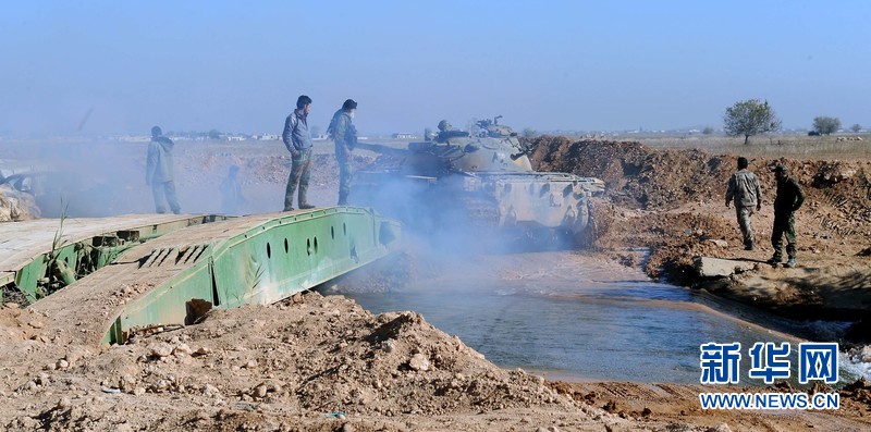 在叙利亚阿勒颇克韦里斯空军基地,一辆坦克从浮桥旁经过。新华社记者张迺杰摄
