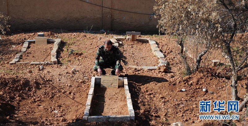 在叙利亚阿勒颇克韦里斯空军基地,一名政府军士兵蹲在墓地中央。新华社记者张迺杰摄