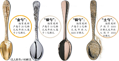 从具体标准来看,“金勺”指家庭财产高于20亿韩元(约合人民币1143万元)或年收入高于2亿韩元;“银勺”指家庭财产高于10亿韩元或年收入高于1亿韩元;“铜勺”指家庭财产高于5亿韩元或年收入5500万韩元;家庭财产低于5000万韩元或年收入低于2000万韩元的则被称为“土勺”。