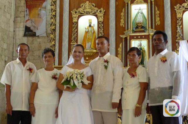 在菲律宾天主教婚礼上身穿“巴隆他加禄”的新郎和家人。