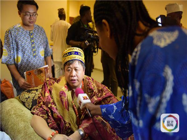 图为李庆勇在被授予“酋长”头衔后接受尼日利亚国家电视台采访。