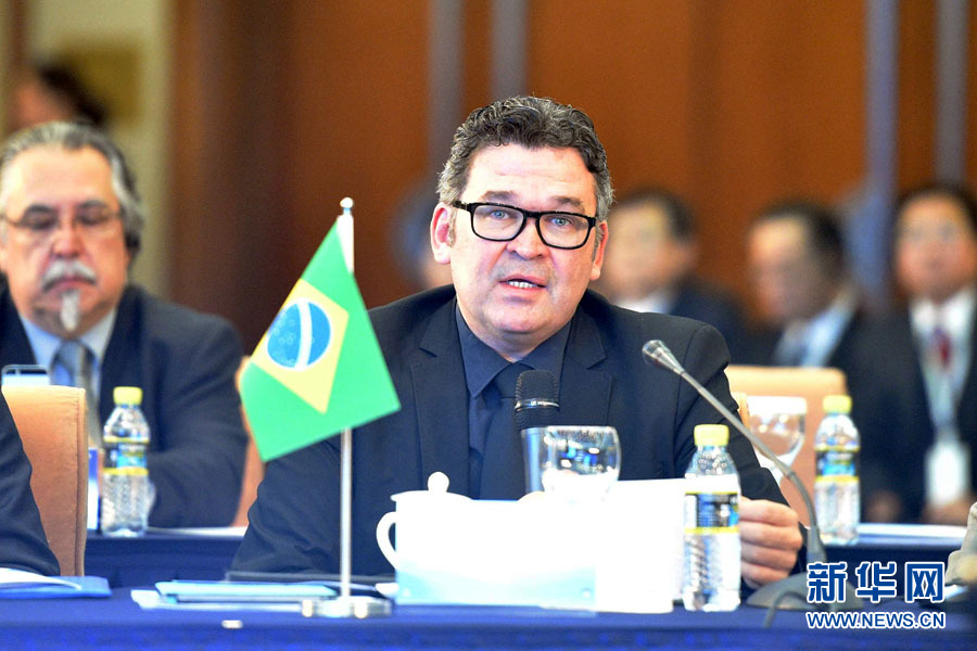 12月1日,首届金砖国家媒体峰会在京召开。图为首届金砖国家媒体峰会共同主席、巴西国家传播公司总裁多斯桑托斯发表演讲。新华网 郭小天 摄