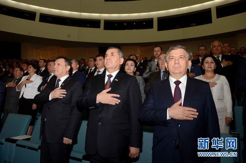 12月5日晚,乌兹别克斯坦首都塔什干“国际论坛宫”,乌兹别克斯坦总理米尔济约耶夫(右)、乌最高会议参议院(议会上院)主席尤尔达舍夫(中)、立法院(议会下院)议长伊斯马伊洛夫(左)在庆祝宪法日23周年活动上。新华社记者沙达提摄