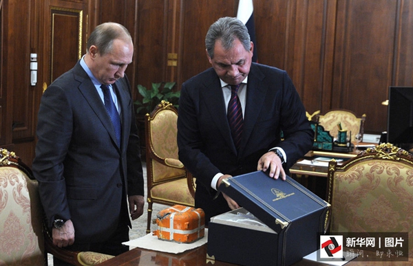 当地时间2015年12月8日,俄罗斯国防部长绍伊古向普京展示和介绍被土耳其击落的苏-24战机的黑匣子。