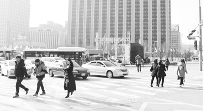 韩国首尔大街上行人过马路,右转的机动车不管有无信号灯都会停下来让行人。本报记者 陈尚文摄