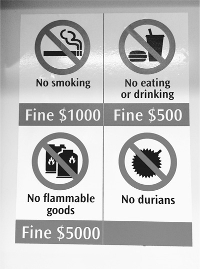 新加坡地铁内的禁止标志,上面标有明确的罚款金额。本报记者 俞懿春摄