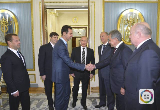 10月20日,在莫斯科克林姆林宫,俄罗斯总统普京(右四)向来访的叙利亚总统巴沙尔·阿萨德(左三)介绍俄国防部长绍伊古(右二)。(新华社/路透)