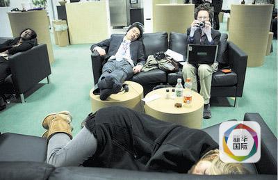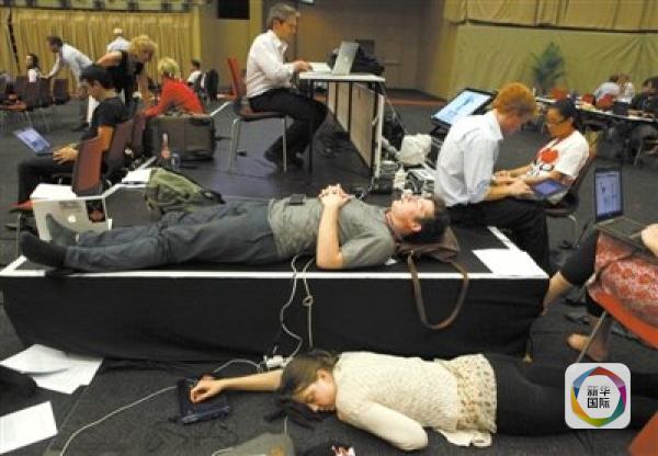 每每气候谈判,最后一天会场不关门,到处都会有席地而睡或的记者,能抢到个沙发,已经是豪华待遇了。一些记者打趣说,连睡觉也分等级,倒头睡、墙边地上睡、椅上睡,沙发上睡。最后一种最幸福。