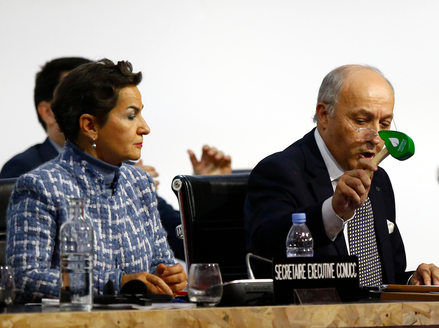 12月12日,在巴黎北部市郊的布尔歇展览中心,法国外交部长、巴黎气候变化大会主席法比尤斯在巴黎气候变化大会上落锤,标志着巴黎气候协议的达成。联合国大会主席吕克托夫特12日发表声明,欢迎巴黎气候变化大会当天通过全球气候变化新协议。