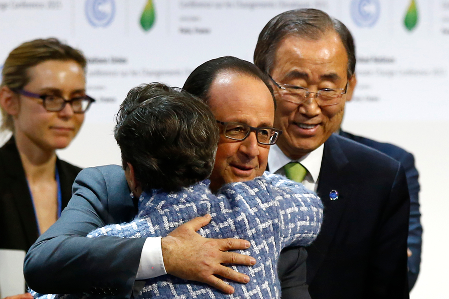 12月12日,在巴黎北部市郊的布尔歇展览中心,法国外交部长、巴黎气候变化大会主席法比尤斯在巴黎气候变化大会上落锤,标志着巴黎气候协议的达成。联合国大会主席吕克托夫特12日发表声明,欢迎巴黎气候变化大会当天通过全球气候变化新协议。