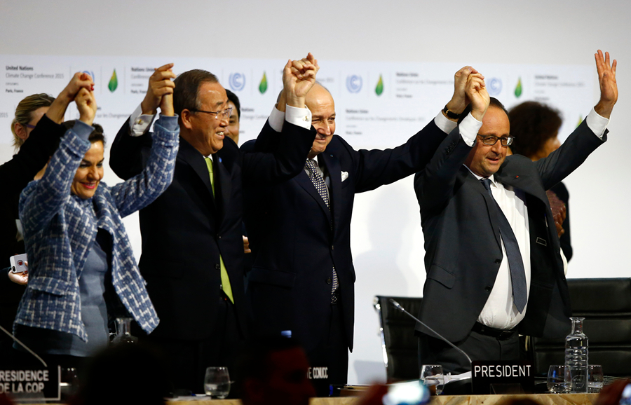 12月12日,在巴黎北部市郊的布尔歇展览中心,法国外交部长、巴黎气候变化大会主席法比尤斯在巴黎气候变化大会上落锤,标志着巴黎气候协议的达成。联合国大会主席吕克托夫特12日发表声明,欢迎巴黎气候变化大会当天通过全球气候变化新协议。